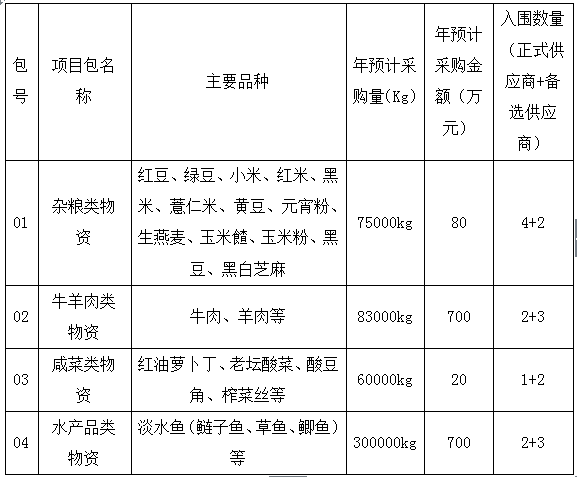 4.采购内容:通过公开招标确定华中科技大学(主校区)杂粮、牛羊肉、水产品、咸菜等4类伙食物资的入围供应商及首个周期的供货价格;通过周期性定价确定后续各周期实际供货商及供货价格。定价周期及定价方式详见文件中的第三章。